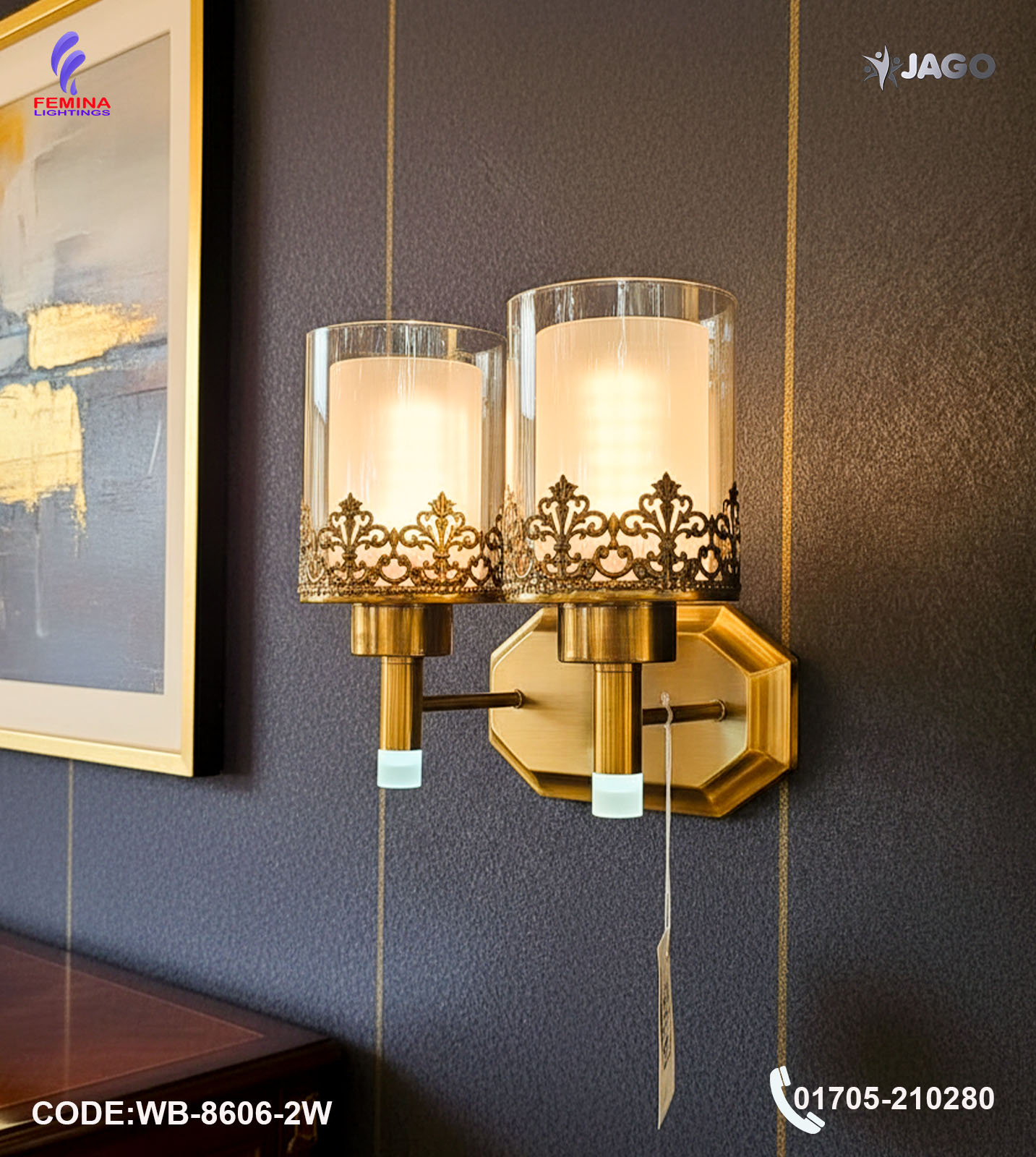 Enhance your interior with the elegant and modern Jago WB-8606-2W Antique Brass Wall Light, now available at Femina Lightings. Designed to blend contemporary aesthetics with functional lighting, this premium wall-mounted fixture adds a warm and sophisticated glow to any space.