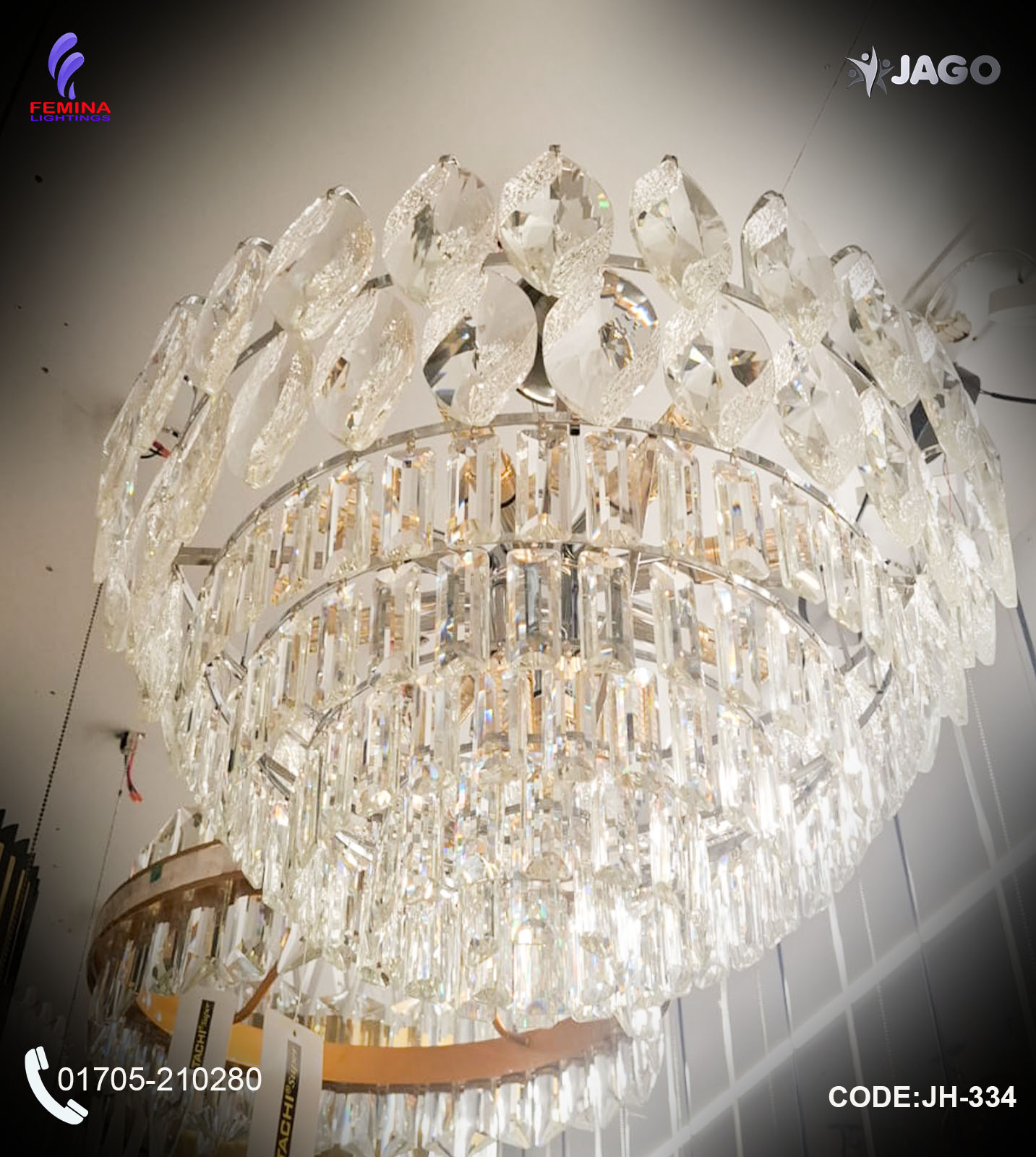 Jago crystal chandelier, modern gold chandelier, semi-flush ceiling light, JH-334 chandelier, luxury lighting Bangladesh, home décor lighting, Femina Lightings chandelier, LED ceiling chandelier